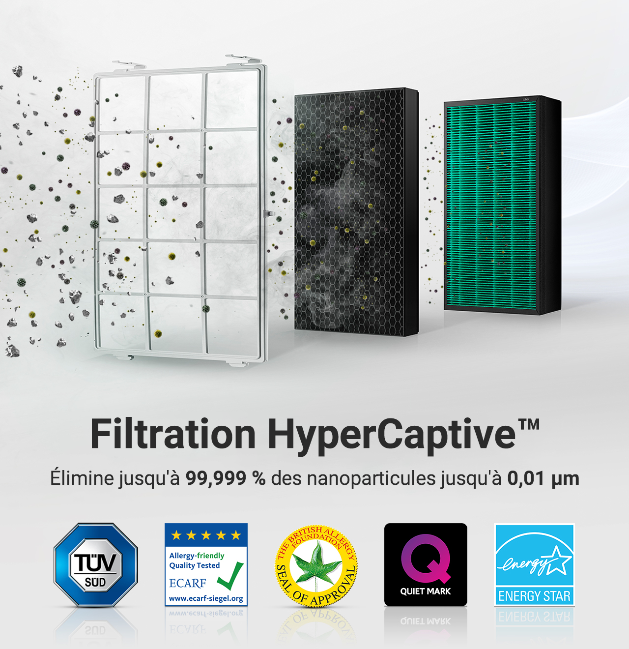 Chez Coway, nous voulons assurer votre bien-être ; c'est pour cette raison que nous avons développé le processus de filtration HyperCaptive™, à la pointe de la technologie, pour éliminer jusqu'à 99,999 % des particules de taille nanométrique aussi petites que 0,01μm¹.
