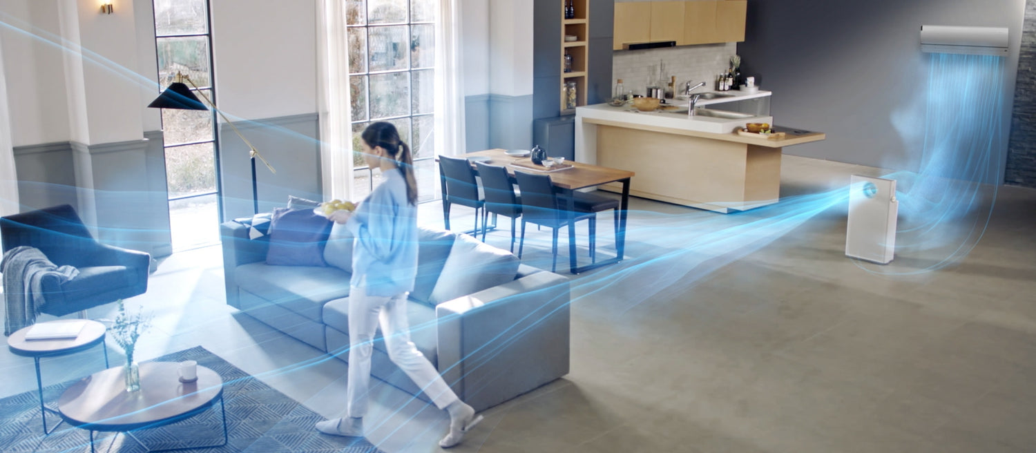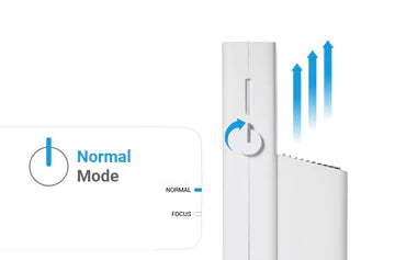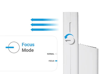 Le mode Focus envoie l'air purifié avec force vers l'avant, et l'air purifié est diffusé plus rapidement dans toute la pièce. Ce mode est très efficace lorsqu'il est associé à un système de climatisation/chauffage, car le Jet fait circuler l'air plus rapidement et réchauffe/refroidit l'espace, ce qui permet de réduire la consommation d'énergie globale.