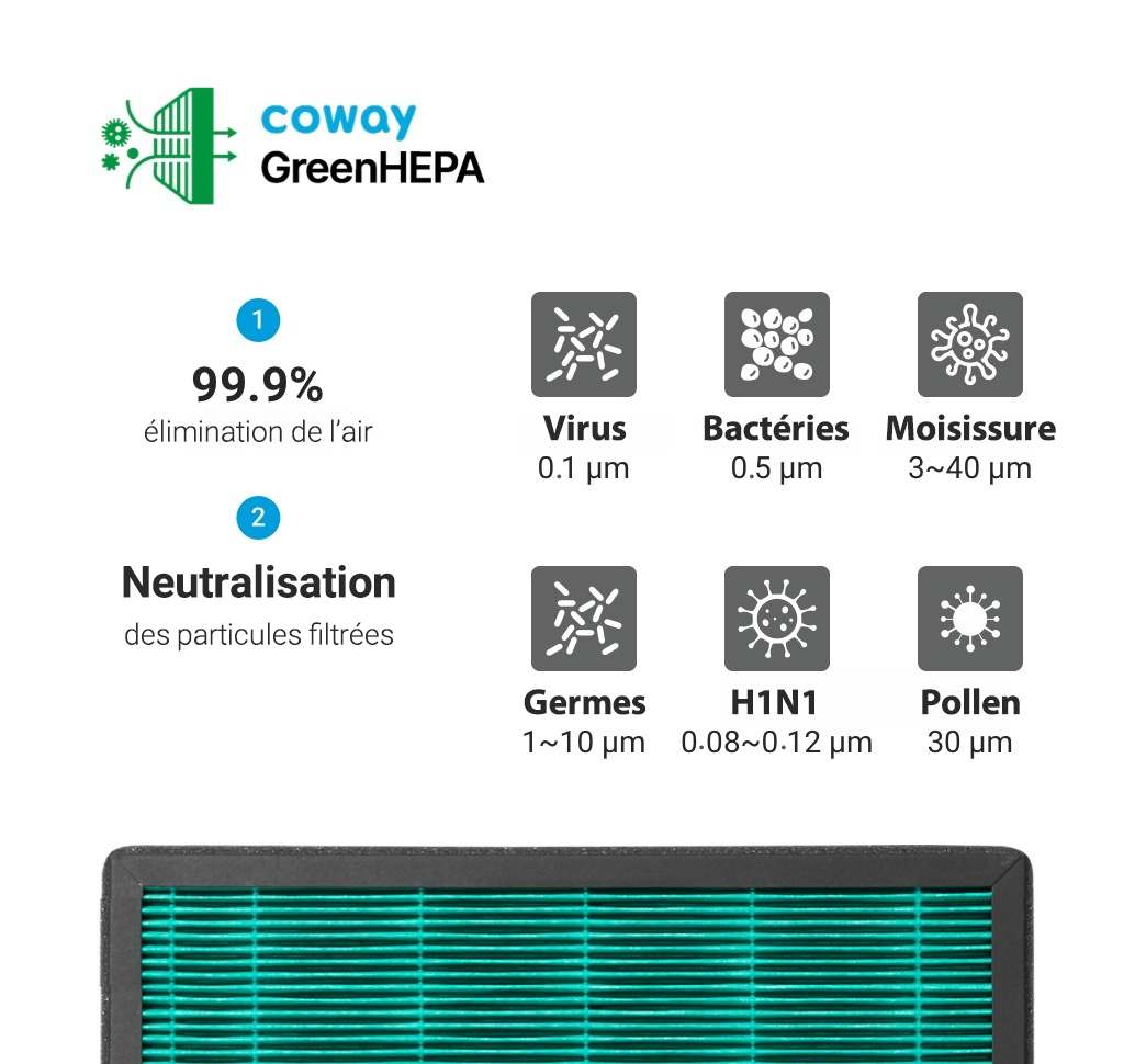 Filtre HEPA avec technologie anti-virus GreenHEPA™ qui élimine les particules en suspension dans l'air telles que les allergènes, les bactéries, les phanères, les poussières fines, les moisissures, le pollen et les virus.